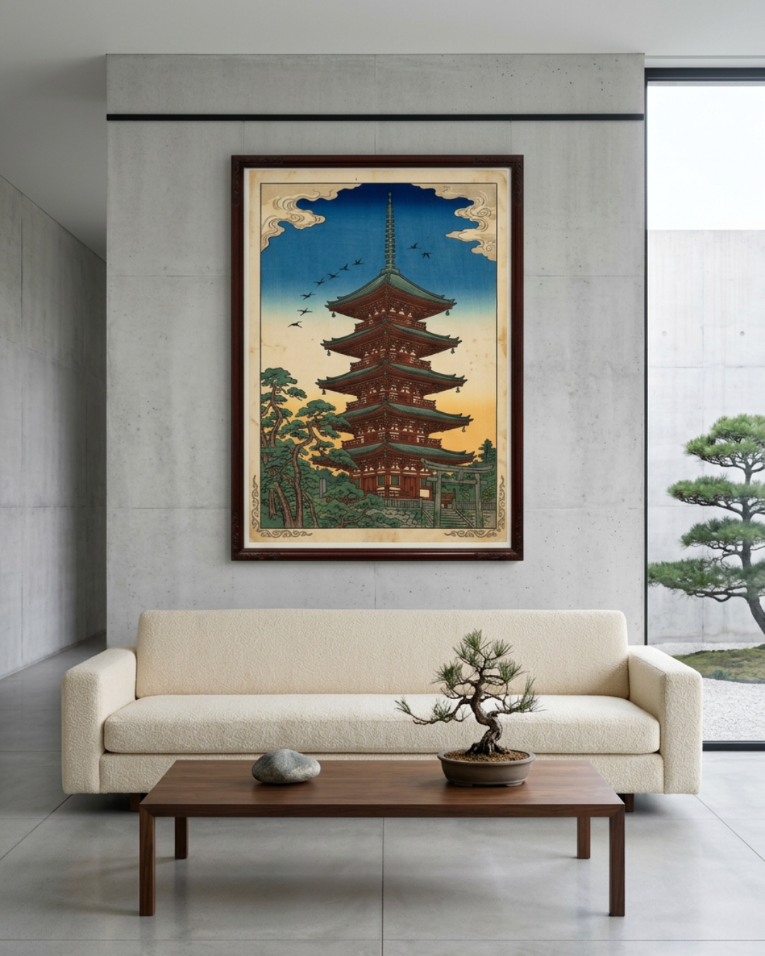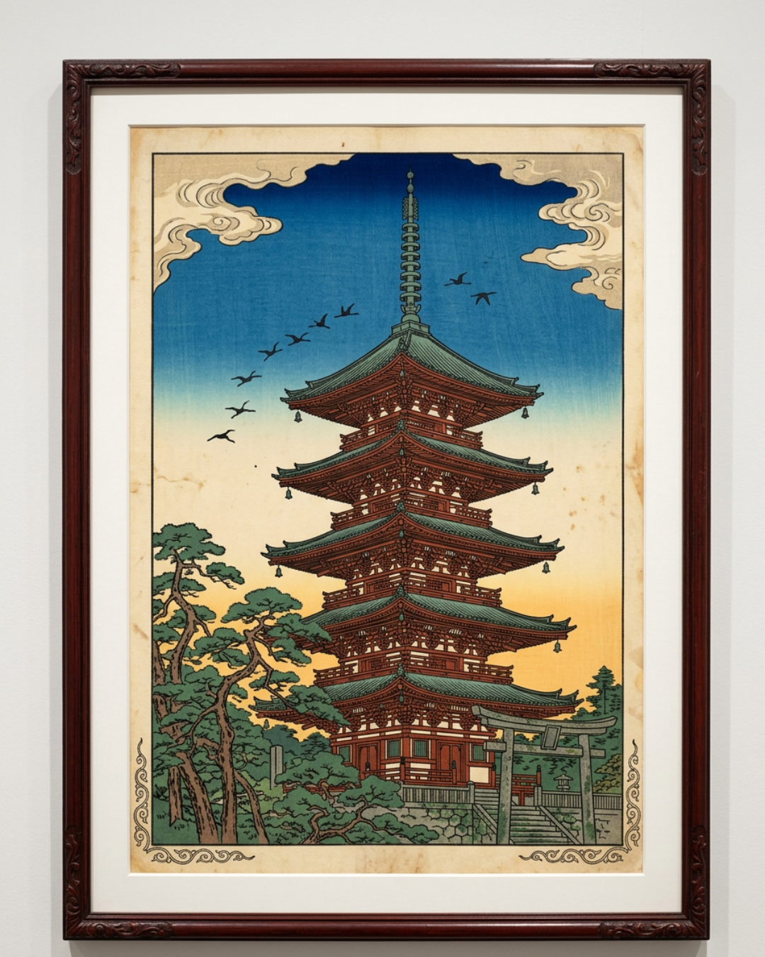 In this piece, the pagoda stands as the heart of the scene—tall, orderly, and serene against a sky that shifts from warm light to deep blue. The layered roofs create a beautiful rhythm of form, while the birds overhead add a subtle feeling of movement and life. Framed by pine trees and traditional architectural elements, the image conveys not only visual beauty, but also the spiritual calm often associated with sacred spaces in Japan. More than a landscape, this artwork offers a sense of quiet elevation, inviting the viewer to pause and experience the harmony between structure, nature, and sky.