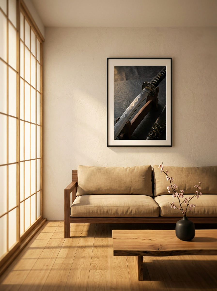 Stone texture, a wooden stand, and the quiet, wave-like reflection along the blade—every detail in this photoreal artwork pulls the room into focus. While a katana is often associated with power, this print carries something different: restraint, clarity, and calm presence.